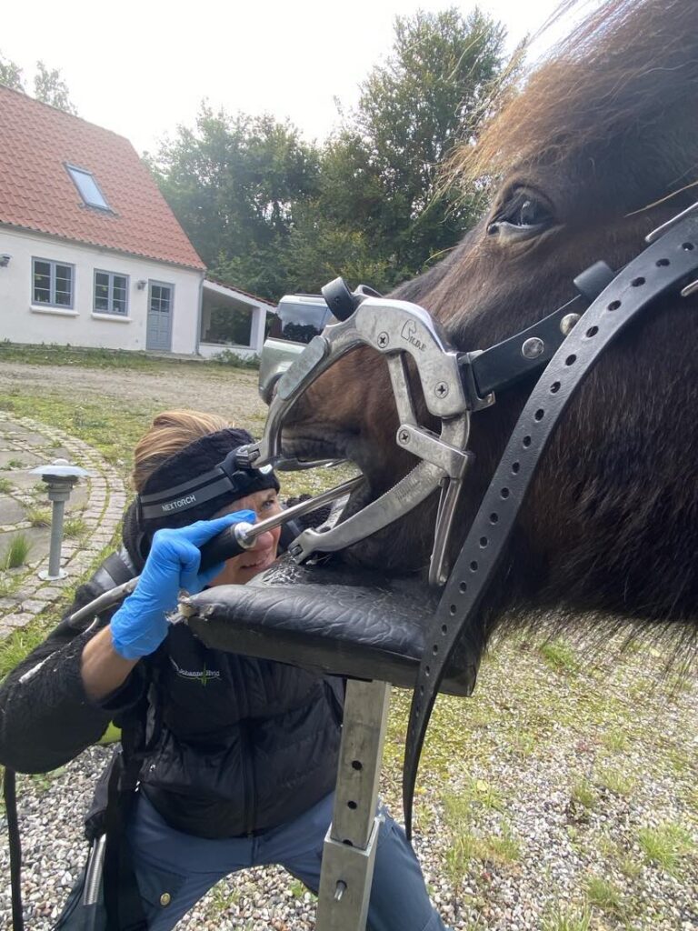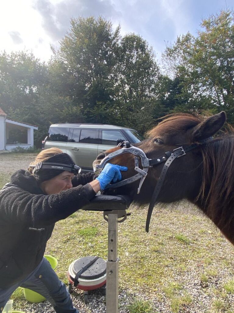 Da hun havde folet og hendes fine lille føl var et par måneder, så var det tid til det store tandeftersyn. Jeg håbede, at der var noget med tænderne, fordi så var det en mulighed for at “fixe” problemet med at holde hende i god huld. Hun havde tandspidser flere steder i munden og de blev raspet væk. Der var også huller i to af hendes tænder, som jeg blev advaret om måske gjorde ondt? De to tænder kunne evt. hives ud, men det synes jeg alligevel ikke….